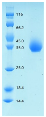 理論分子量為 30.97kDa,由于糖基化,SDS-PAGE 還原電泳分子量大小為35-45kDa。
