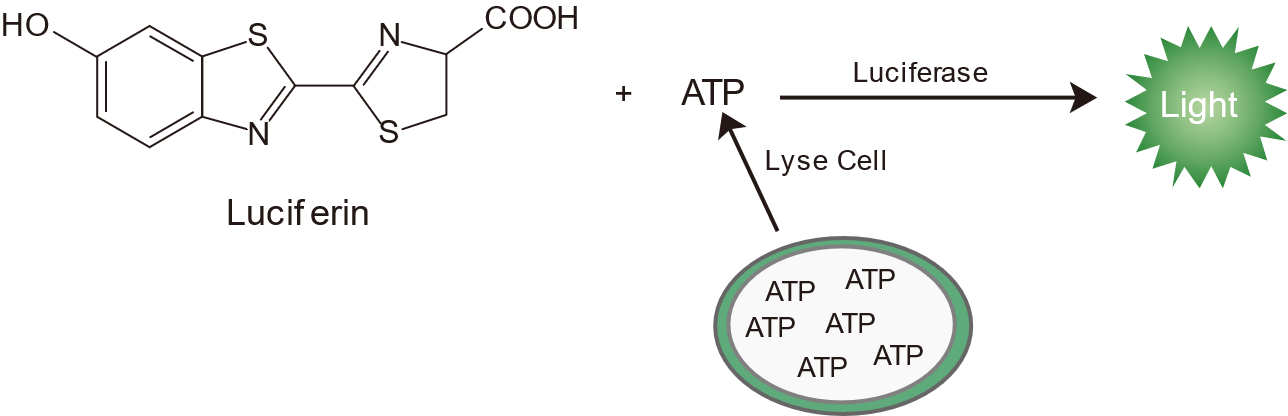 本試劑中由于高純度的熒光素底物、熱穩(wěn)定的熒光素酶和經(jīng)過優(yōu)化的反應(yīng)試劑,本產(chǎn)品具有更強的細胞裂解能力,可用于3D 微組織培養(yǎng)的細胞活力分析。在細胞培養(yǎng)物中加入本產(chǎn)品使細胞團裂解,釋放出ATP,即可產(chǎn)生如圖所示的反應(yīng),發(fā)出穩(wěn)定的光信號。